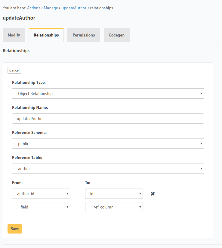 Actions are a way to extend your GraphQL schema with custom queries or mutations. It is quite a typical case that an action’s response is actually related to existing objects in the schema and the action needs to be connected with the rest of the graph.