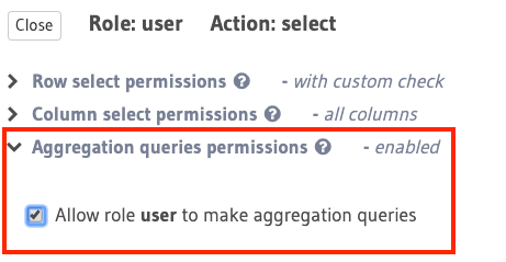 In the case of select operations, access to aggregation queries can be restricted for a given role using this configuration.