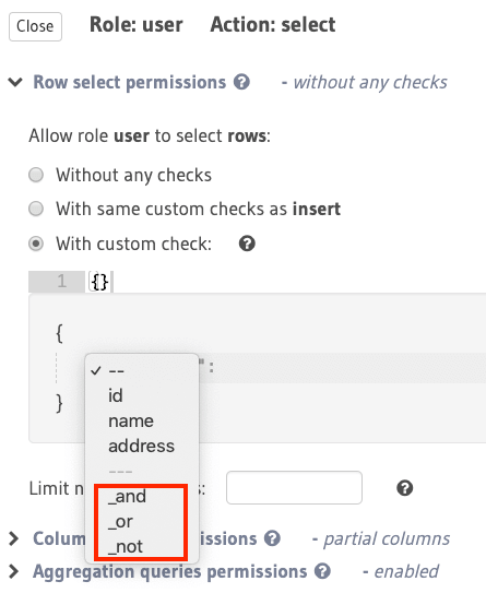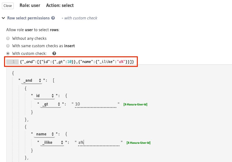 For example, using the _and operator, you can construct a rule to restrict access for select to rows where the value in the id column is greater than 10 and the value in the name column starts with “a” or “A”: