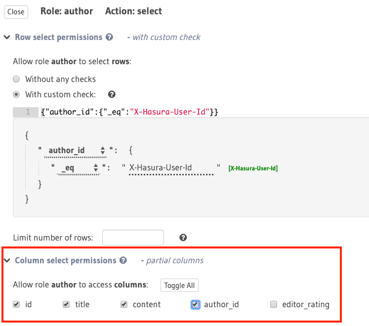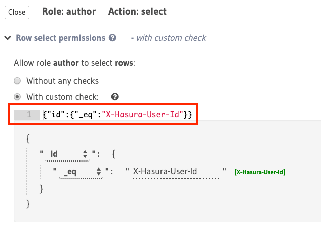 For example, to allow an author to access only their articles, you can use the X-Hasura-User-ID session variable to construct a rule to restrict access for select to rows in the articles table where the value in the id column is equal to the value in the session variable (assuming this variable is being used to indicate the author’s ID):