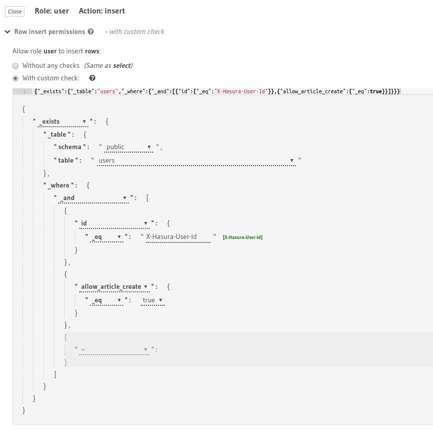 For example, say we want to allow a user to insert an article only if the value of the allow_article_create column in the users table is set to true. Let’s assume the user’s id is passed in the X-Hasura-User-ID session variable.