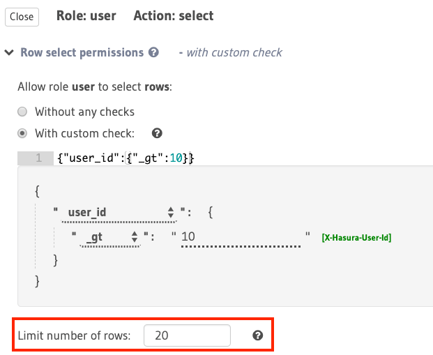 In the above example, this configuration restricts the number of accessible rows (based on the rule: {"id":{"_eq":"X-Hasura-User-Id"}}) to 20.