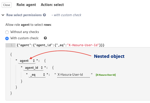 For example, let’s say you have an object relationship called agent from the authors table to another table called agent (an author can have an agent) and we want to allow users with the role agent to access the details of the authors who they manage in authors table. We can define the following permission rule that uses the aforementioned object relationship: