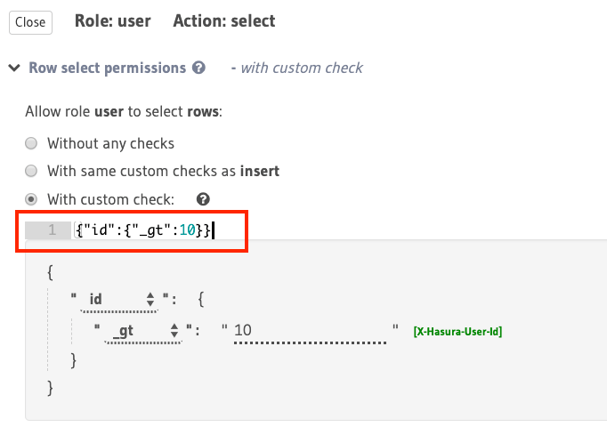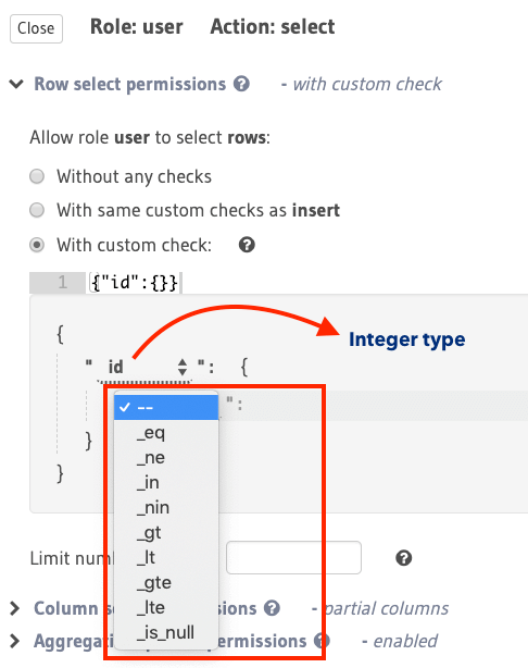Let’s take a look at the different configuration options available to define a permission rule. Permission rules are defined for each role, table, operation (insert, select, update, delete) by using the console or the metadata APIs for permissions.