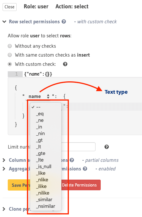 Type-based operators (depending on the column type) are available for constructing row-level permissions. You can use the same operators that you use to filter query results along with a few others to define permission rules.