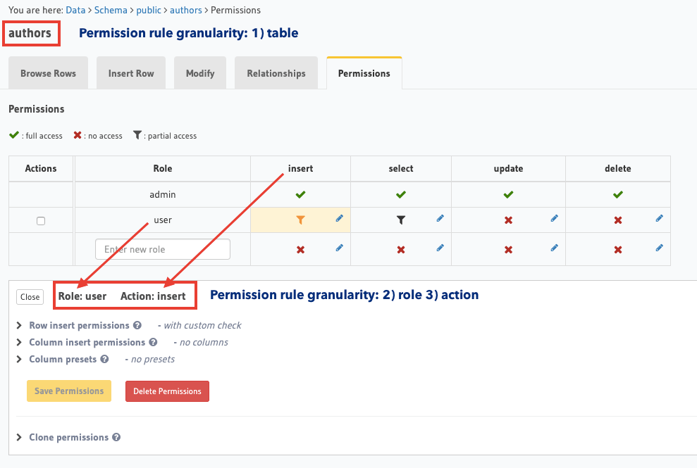 Access control rules in Hasura are defined at a role, table and action (insert, update, select, delete) level granularity:
