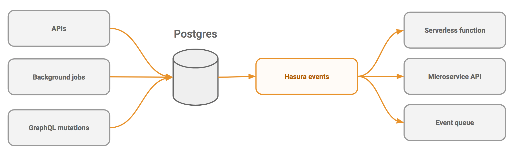 Hasura can be used to create event triggers on tables in the Postgres database. Event triggers reliably capture events on specified tables and invoke webhooks to carry out any custom logic.