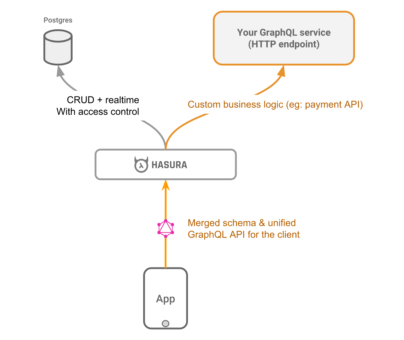 Hasura has the ability to merge remote GraphQL schemas and provide a unified GraphQL API. Think of it like automated schema stitching. All you need to do is build your own GraphQL service and then provide the HTTP endpoint to Hasura. Your GraphQL service can be written in any language or framework.