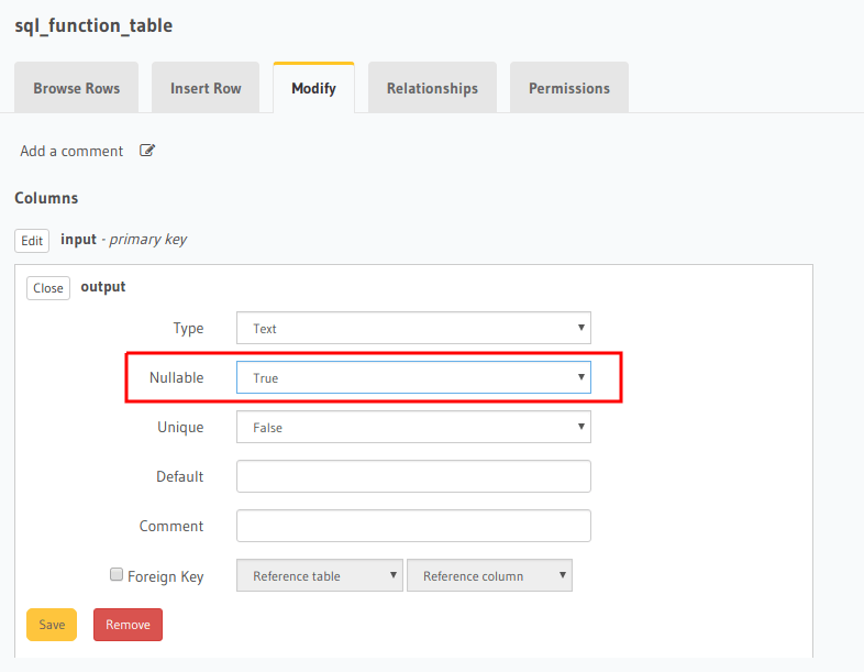 - Modifying the table to allow the columns we want to be set by the SQL functions to be nullable (to allow the initial insert before the SQL function is run).