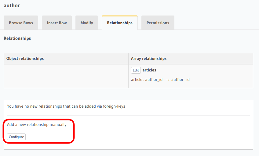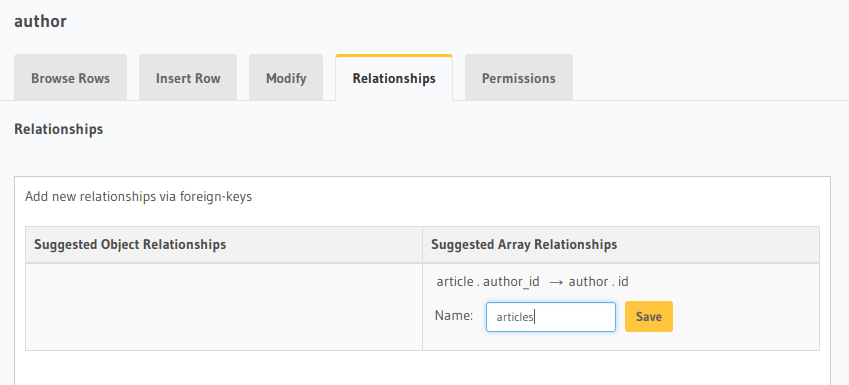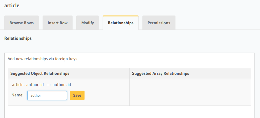 The console infers this using the foreign-key created above and recommends the potential relationship in the Relationships tab of the article table.