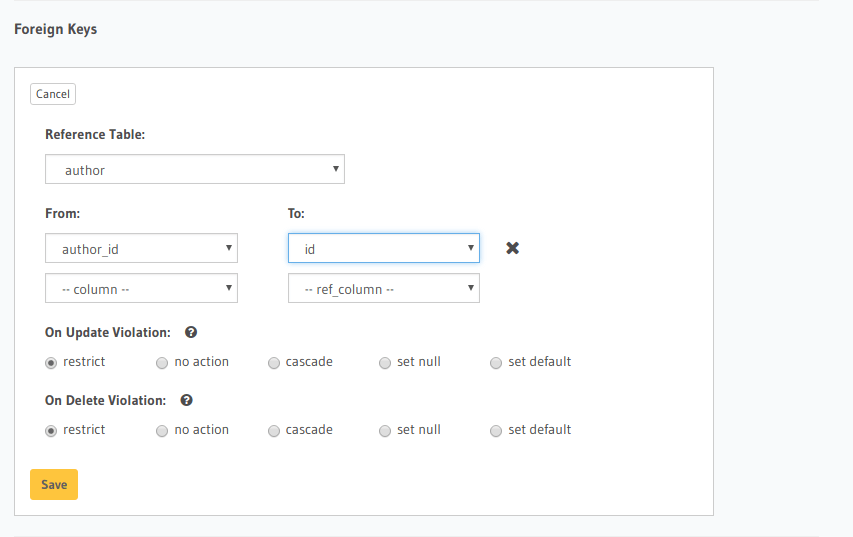 In the console, navigate to the Modify tab of the article table. Click the Add button in the Foreign Keys section and configure the author_id column as a foreign-key for the id column in the author table: