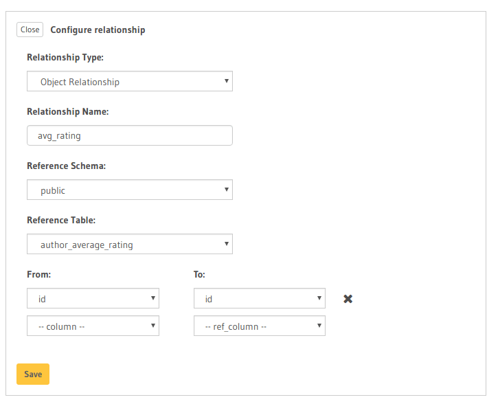 Let us now create an object relationship called avg_rating from the author table to the author_avg_rating view using a manual relationship: